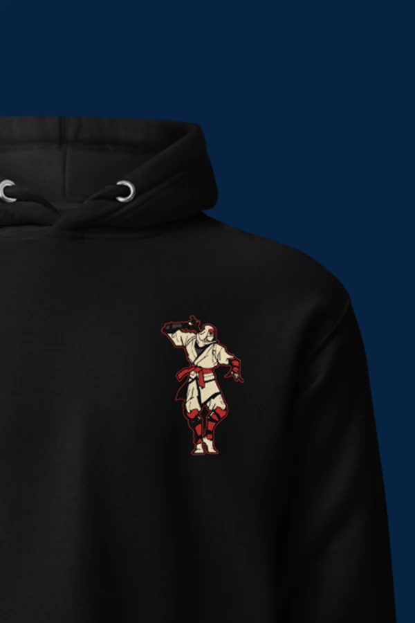 The SHINOBI Ninja Icons Hoodie features two embroidered emblems: a ninja on the chest; and the Oburo Clan crest on the left sleeve. The SHINOBI: Art of Vengeance logo is printed on the back.